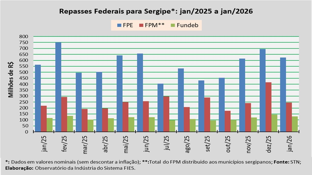 Análise realizada pelo Observatório da Indústria do Sistema FIES, com base nos dados da Secretaria do Tesouro Nacional (STN), indicou que o repasse do Fundo de Participação dos Estados (FPE) para Sergipe, em janeiro do ano corrente, foi de aproximadamente R$ 623,3 milhões.