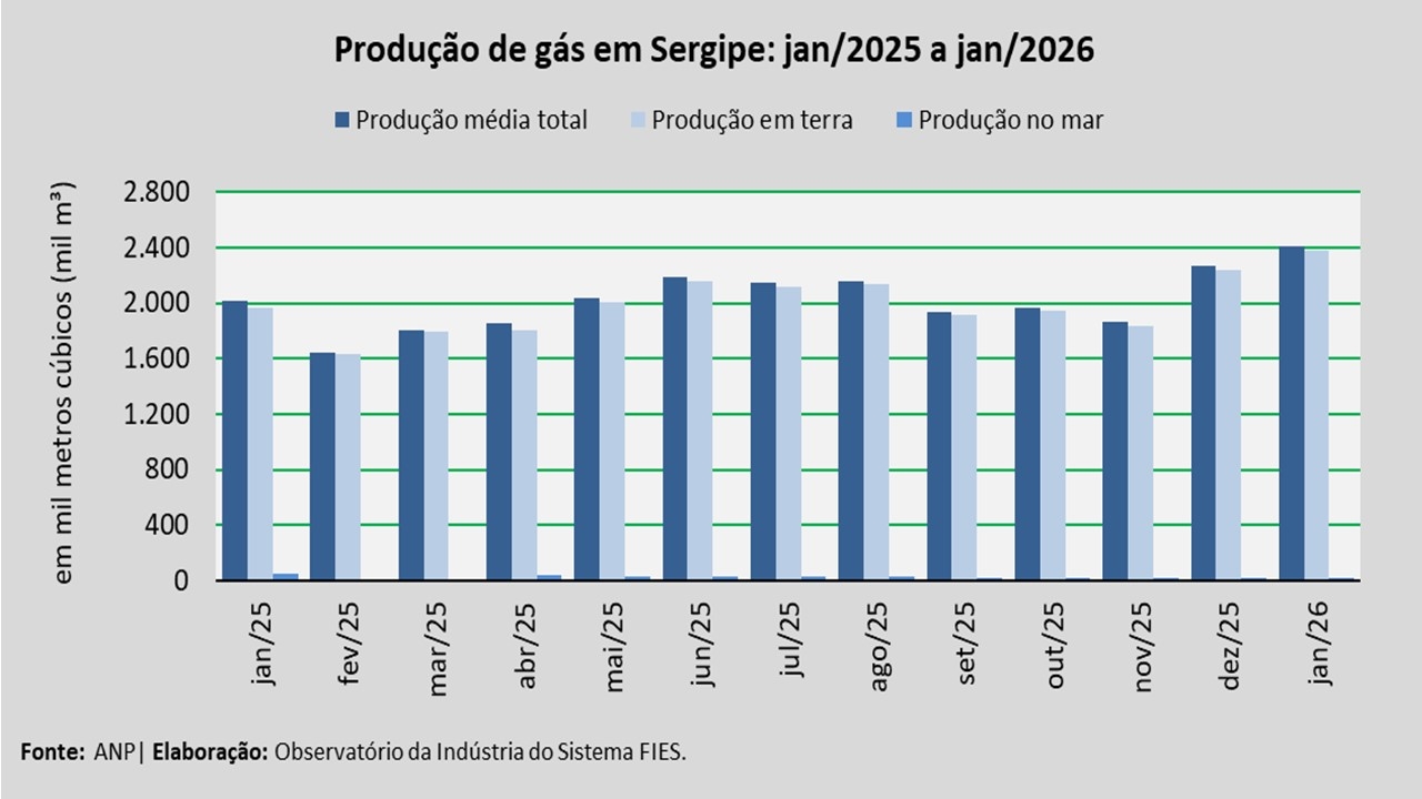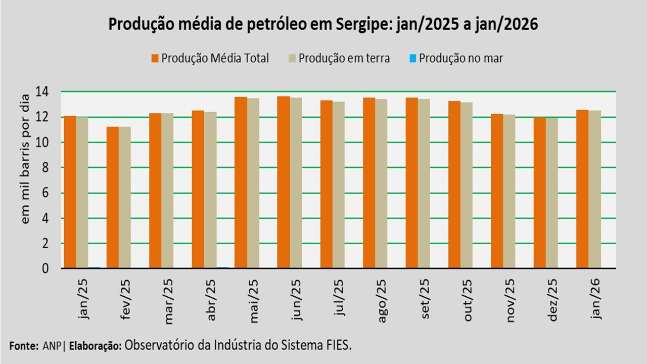 Análise realizada pelo Análise realizada pelo Observatório da Indústria do Sistema FIES, com base nos dados da Agência Nacional do Petróleo, Gás Natural e Biocombustíveis (ANP), revelou que a produção de petróleo no estado, no mês de janeiro, alcançou, em média, 12,6 mil barris por dia (bpd), registrando um acréscimo de 4,9% em relação à produção média do mês anterior (dezembro/2025). No comparativo com janeiro de 2025, verificou-se acréscimo de 4,1%.