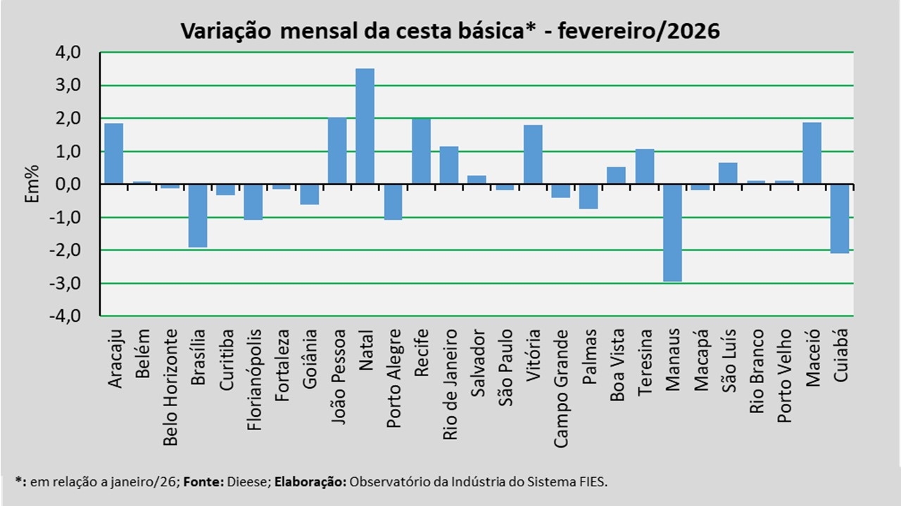 No mês analisado, levando-se em consideração a comparação com o mês anterior (janeiro/2026), observou-se aumento no valor da cesta básica em 14 das 27 capitais brasileiras, com destaque para: Natal (+3,52%), João Pessoa (+2,03%) e Recife (+1,98%). Dentre as capitais que apresentaram queda no valor da cesta, os percentuais de redução mais expressivos foram registrados em Manaus (-2,94%), Cuiabá (-2,10%) e Brasília (-1,92%). ![]()
