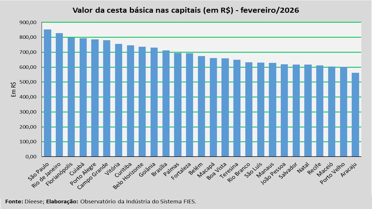 Análise realizada pelo Observatório da Indústria do Sistema FIES, com base nos dados da Pesquisa Nacional da Cesta Básica, realizada pelo Departamento Intersindical de Estatística e Estudos Socioeconômicos (DIEESE), revelou que, em fevereiro, o valor médio da cesta básica na capital sergipana ficou em R$ 562,88, o menor custo dentre as capitais pesquisadas.